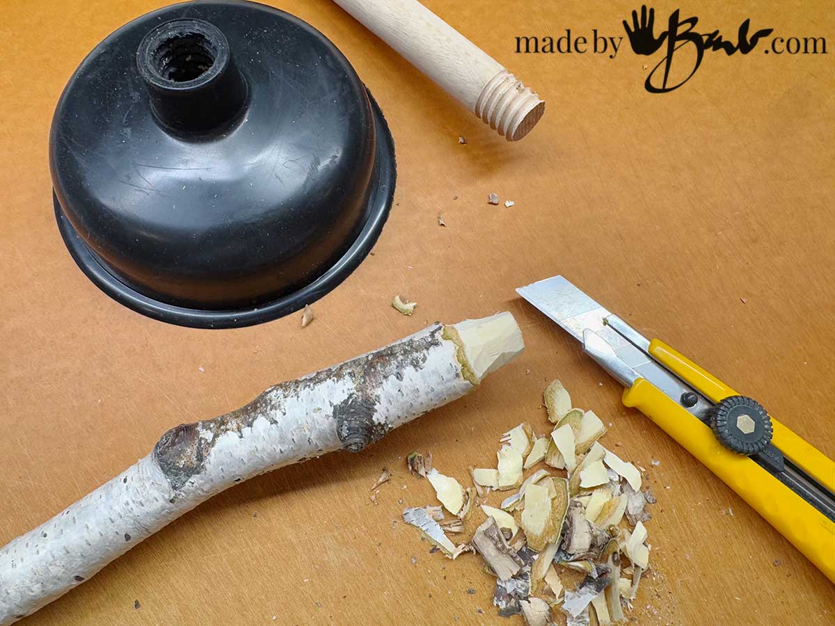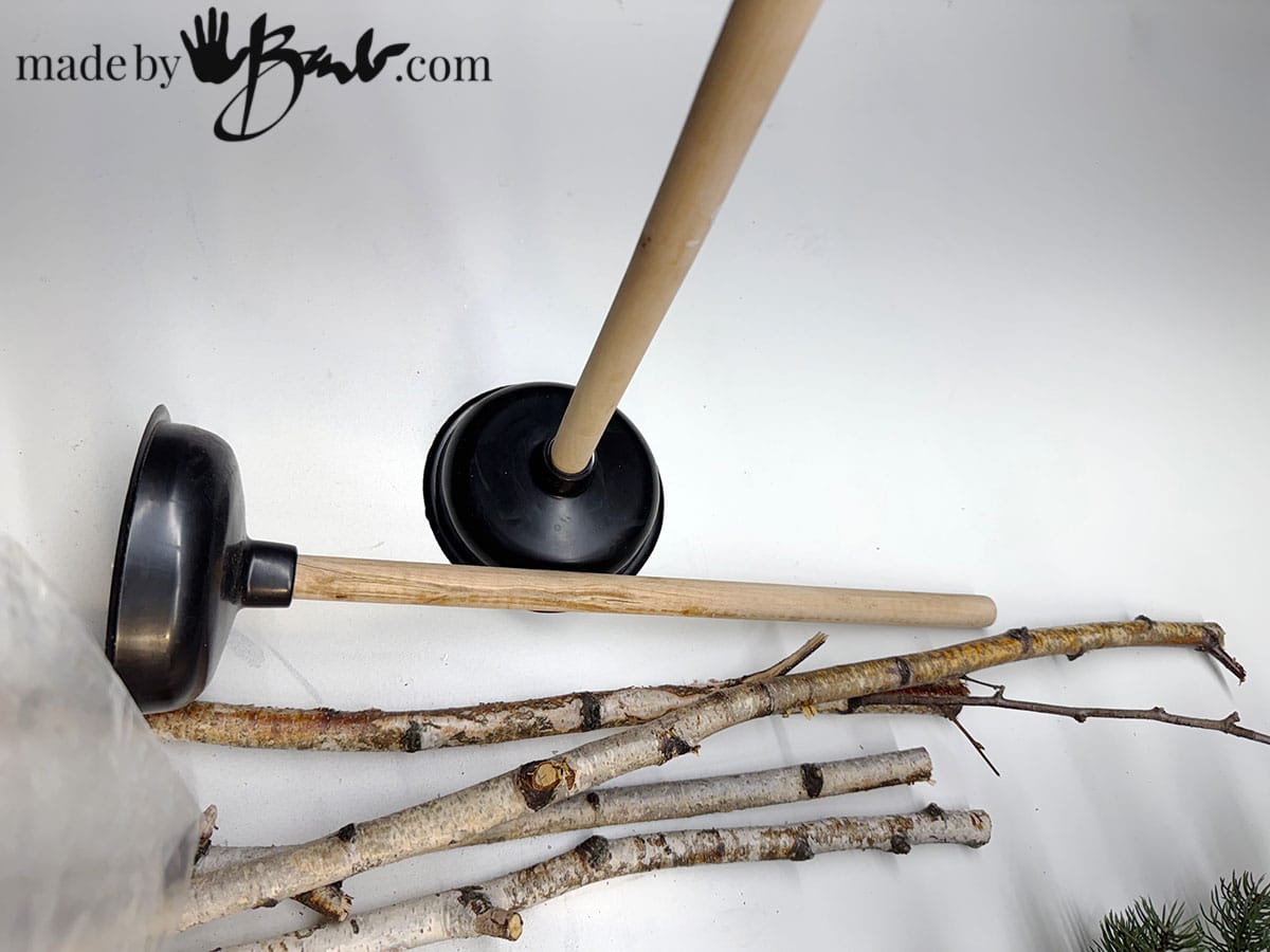 Unscrew the wooden handle out of the rubber plunger base. If you want to even simplify more you could use that as the trunk, but I like the real look of branches.
